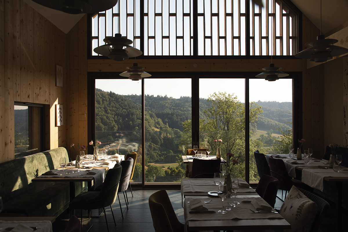 « On souhaitait respecter au mieux la forte identité de ces décors et continuer à faire vivre ce village qui nous tient à cœur », raconte Christelle Boyer, originaire de Tournemire. Avec son mari Mickaël, ils ont l’idée en 2018 d’un restaurant qui s’ouvrirait plein sud, au cœur d’une ancienne grange. C’est ainsi que naît La Petite Grange en 2021, superbe bâtisse rénovée avec goût à l’aide d’une imposante charpente métallique, offrant une vue panoramique sur la vallée et le château depuis la salle du restaurant. À la fois maîtresse des lieux et star du restaurant, l’immense baie vitrée permet de dîner accompagné du seul spectacle de la nature et des lumières changeantes au fil de la journée. « La vie à La Rochelle nous manque forcément un peu mais c’est magnifique ici aussi, on ne se lasse pas des couchers de soleil qui baignent la salle d’une belle lumière chaque jour de l’année », se réjouit Caroline Cloteau, la femme du chef, originaire comme lui de la ville côtière.